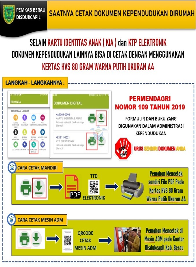 Bagi Masyarakat Kabupaten Berau untuk Dokumen Kependudukan sudah saatnya di cetak secara mandiri. Selain KTP-el dan KIA Dokumen Kependudukan Lainnya bisa di cetak secara mandiri dengan menggunakan